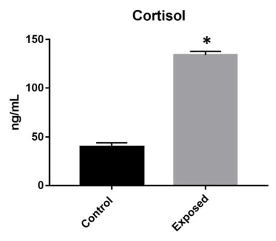 Serum LH, FSH, and cortisol levels in Anguilla anguilla control and exposed specimens. Cocaine exposure decreased LH and FSH levels and increased cortisol levels. Values are means ± SD of the mean. (*) serum significantly different (p < 0.05) from the control values.