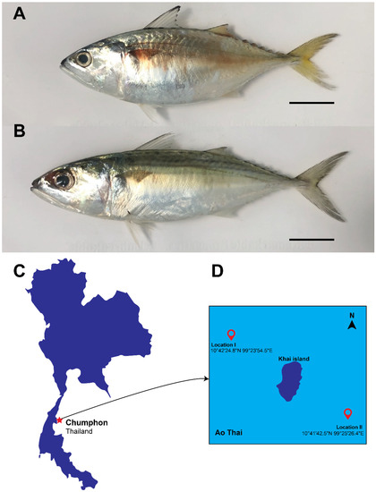 The Rastrelliger genus belongs to the family Scombridae, which includes epipelagic fishes found in tropical and subtropical regions. There are three species in the Rastrelliger genus: Rastrelliger brachysoma (short mackerel), Rastrelliger kanagurta (Indian mackerel), and Rastrelliger faughni (island mackerel). The short mackerel and Indian mackerel are economically important species in the Gulf of Thailand. However, the numbers of both species are seriously declining in the wake of large annual captures [1,2]. The fishery and aquaculture statistics published by the Food and Agriculture Organization of the United Nations (FAO) revealed that R. kanagurta and R. brachysoma were among the 70 principal species with capture productions of more than 150,000 tons in 2019 [3].