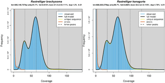 The raw data for R. brachysoma and R. kanagurta obtained from the sequencer had total sizes of 73.4 and 77.2 Gbp, respectively. After the raw data were cleaned, the total file sizes of both read libraries were 68.9 and 71.4 Gbp, respectively. The genome sizes of the two specimens were estimated from k-mer analyses, which showed that the peak 21-mer distributions of both were at 62× (Figure 2). The estimated genome sizes of R. brachysoma and R. kanagurta were 680.14 Mbp and 688.82 Mbp, respectively. The heterozygosity and repeat content information are given in Table 1.