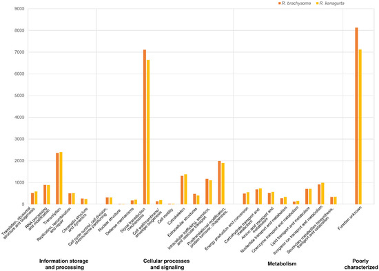Classification of Eukaryotic Orthologous Groups (KOGs) in gene prediction. Orange bars represent the KOGs of R. brachysoma and yellow bars the KOGs of R. kanagurta. KOG categories appear on the horizontal axis, and the frequencies of the categories are indicated along the vertical axis.