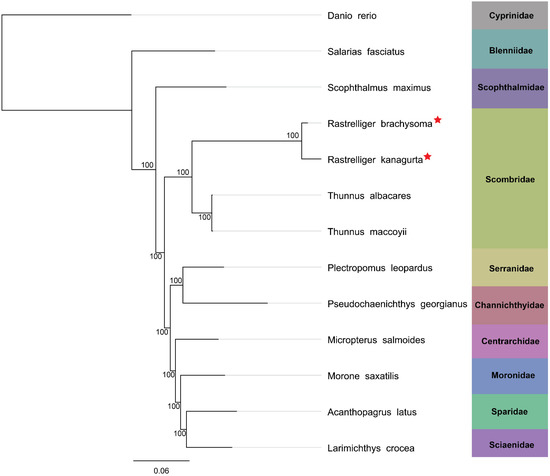 The genome similarities between R. brachysoma and R. kanagurta and other species were determined with NCBI megablast [16] using several scaffolds for both fishes. Species closely related to the two species of interest were then selected for use in the phylogenetic analysis. A total of 13 fish species (Table S1) were included in the analysis, using Danio rerio as an outgroup. Single-copy ortholog genes were extracted with BUSCO from the annotation files of the selected species, using vertebrata_odb10 as a target database. The extracted single-copy ortholog genes of all 13 samples were aligned with MUSCLE v5.1 [17]. A maximum-likelihood (ML) phylogenetic tree was constructed based on GTR and GAMMA correction using raxmlHPC-PTHREADS v8.211 [18], setting Dario rerio as an outgroup. The bootstrap values were calculated using 1000 replicates.