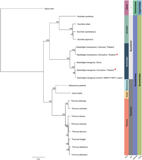 The complete mtDNA genomes of R. brachysoma and R. kanagurta were circular molecules with total lengths of 16,539 and 16,537, respectively. The mtDNA sequences of both species comprised 22 tRNA, 2 rRNA, and 13 protein-coding genes. These two mtDNA genomes shared 96.64% similarity, while the GC content of R. kanagurta (47.7%) was slightly higher than that of R. brachysoma (47.5%). We then used these two sequences to construct a phylogenetic tree with another 16 species from the family Scombridae and one species from the family Cyprinidae (Danio rerio) (Table 5 and Figure 6).