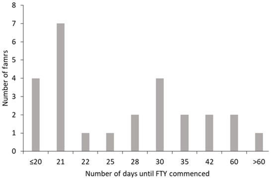 All farms adopted a concentrate ‘build-up’ period before FTY commenced (range, 10–100 days), although the majority of farms had adopted an FTY approach by day 30 of lactation (Figure 1). At the time when FTY was adopted, total concentrate intakes averaged 9.7 kg/d (range: 5–16 kg) for multiparous cows and 7.8 kg/d (range: 3.5–14 kg) for primiparous cows. Across the 26 farms, the average M+ value adopted during months 2–5 post-calving was 20 (range: 8–30) kg and 17 (range: 6–28) kg of milk/day for cows and heifers, respectively. Concentrates offered to support milk produced in excess of the M+ value were offered at a rate of 0.45 kg/kg milk on 19 farms, while three farms used a feed rate of 0.40 kg/kg milk, and the remaining four farms used values of 0.42, 0.43, 0.50 and 0.52 kg/kg milk.