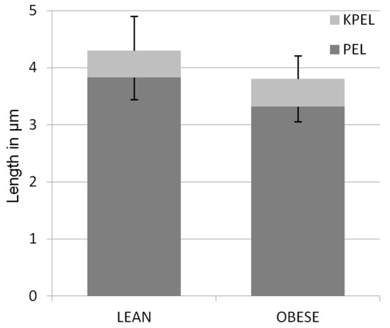 The length of the PEL in the lean group was significantly higher (3.83 ± 0.60 µm (mean ± standard deviation)), than that in the obese group (3.31 ± 0.41 µm) (p < 0.001). The TELL for lean was significantly higher (4.29 ± 0.62 µm) than in the obese group (3.80 ± 0.46) (p < 0.001). There were no differences between KPELL in the lean group (0.47 ± 0.38 µm) and in the obese group (0.50 ± 0.24 µm) (p = 0.653) (Figure 1).