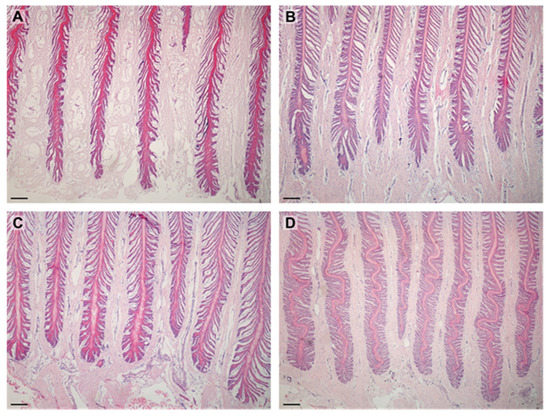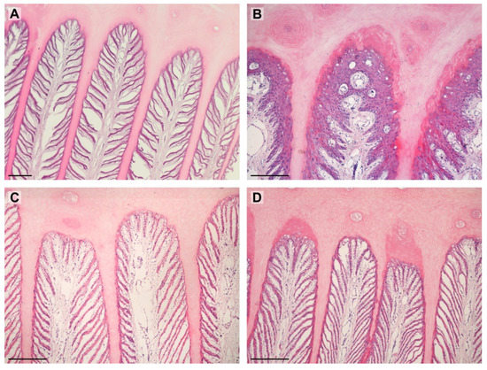 Images show PDLs in examined horses. (A)—separated (lean); (B)—proliferative (lean); (C)—standard (obese); (D)—keratinized (obese). Scale bar = 200 μm.