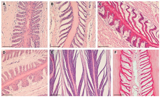 Types of SELs noted in the study: (A)—suprabasal layer hyperplasia (lean); (B)—tapered (lean); (C)—tapering and suprabasal layer hyperplasia (obese); (D)—fused and standard (lean); (E)—separated (lean); (F)—tapered (obese). Scale bar = 100 μm.