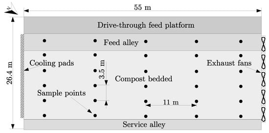 Twenty five measurements points were defined in the compost bedded area and five points in the feed alley area at a high of 2 m above the floor, the sensors were arranged as shown in the Figure 2. Dry-bulb temperature and relative humidity were measured using digital sensors (DHT22; range measurements: 0 to 100% for relative humidity and −40 to 80 °C for dry-bulb temperature; accuracy: ±2% and ±0.5 °C; Aosong Electronics Co., Ltd, Guangzhou, China). Thermal conditions outside the facility were also measured using the same type of sensors inside a meteorology cover. Several Arduino Mega 2560 Rev. 3 open-source electronic developed platform (https://www.arduino.cc/, accessed on 3 July 2022) were used as dataloggers to collect the data, with up to four sensors per device.
