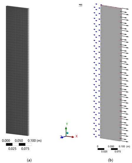 A structured mesh with linear order elements was used to meshing the pad model. Element sizes of 0.025 and 0.01 m were defined along the height and width of the pad section, respectively. Several refinements of the mesh in the flow direction (thickness) were compared. Five inflation layers with a first layer 0.002 m and 1.2 of growth rate were defined in the top and bottom regions of the pad. The pad meshing for 50 divisions in the flow direction (x-axis) is shown in Figure 3a.