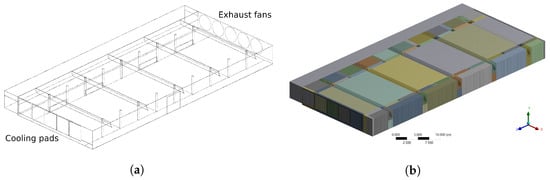 Model (a) and meshing (b) of the dairy cattle barn in the ANSYS CFX® software.