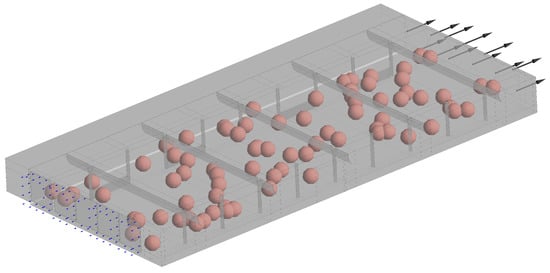 Setup model in the ANSYS CFX® CFD software. The spheres represent the source points of convective heat loss from the cows, without mass, without presenting any resistance in the air flow and spatially random distributed (Appendix C). The red arrows represent the interface between the blocks meshed. The blue arrows are the opening boundary at the pad inlet and the black arrows represent the boundary condition of the exhaust fans.