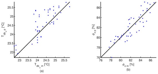 Relationship between the thermal conditions at pad outlet predicted with the CFD model (p) and experimental measurements (m). (a) —Outlet air dry-bulb temperature (). (b)—Outlet air relative humidity (). Solid black line corresponds to the equality line.