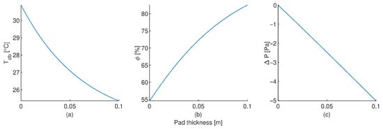 CFD predictions of the dry-bulb temperature (a), relative humidity (b) and pressure drop (c) changes inside the cellulose pad. For 30.9 °C, 54.5% and 1.2 m s of dry-bulb temperature, relative humidity and velocity of the air at inlet pad, respectively.