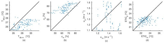 The relationship between the measured and predicted values for the dry-bulb temperature, relative humidity, air velocity and ETIC of the air inside the facility are shown in Figure 8. Biased relationships were observed for the dry-bulb temperature and relative humidity. The CFD model was unable to reach the high levels of dry-bulb temperature measured and consequently, the relative humidity could not decrease, remaining in levels above 70%. According to the statistics show in Table 4, the average mean bias deviations were around 1.5 °C and up to 11% for the dry-bulb temperature and relative humidity, respectively. Standard deviation values confirm that the variation of measurements are higher that the predicted values. Despite of this, the ETIC relationship show less deviation from the equality line, with an average mean bias of 0.26 °C and a prediction variability less than 0.6 °C. A random distribution around equality line was observed for the air velocity relationship, the CFD model predictions show a mean and variability similar to the measurements. The variability between the experimental measurements and the CFD model predictions was quantified using the average RMSE, obtaining 2.0 °C, 13.4%, 0.24 m s and 1.1 °C for , , u and ETIC, respectively. Those values represent relative differences of 6.1%, 19.7%, 3.6% and 14.6%, for each of the simulated variables.