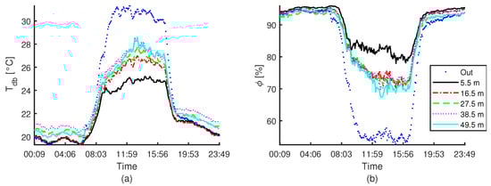 Outside and inside dry-bulb temperature () and relative humidity () along the centre of the compost bed for one day of experimentation are shown in Figure 9. Since the activation of the evaporative pad cooling system (09:00), a significant gradient of the thermal conditions is present from the pad outlet (measured at 5.5 m) up to a distance of 16.5 m, where is located the next sensor. No significant changes in the thermal conditions were observed from this point to the end of the barn (measured at 49.5 m). The gradient increment along the day, even if the external dry-bulb temperature decreased, and is more significant for the sensors located closed to the exhaust fans. The maximum gradient is presented around 14:00 h.