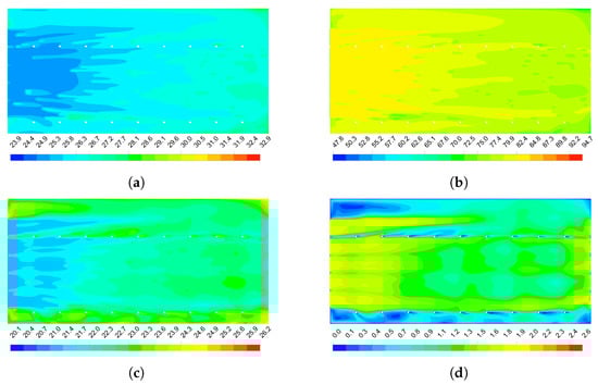Distribution of the air thermal variables analysed inside the tunnel-ventilated compost-packed bedded dairy barn 1.6 m above the floor. (a)—Dry-bulb temperature (°C). (b)—Relative humidity (%). (c)—Equivalent Temperature Index for dairy Cattle (ETIC, °C). (d)—Air velocity (m s). The airflow direction is from left to right.