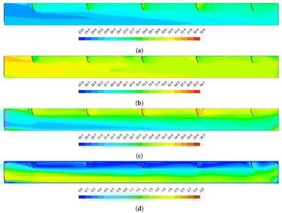 Distribution of air thermal variables analysed along the centre of the tunnel-ventilated compost-packed bedded dairy barn. (a)— Dry-bulb temperature (°C). (b)—Relative humidity (%). (c)—Equivalent Temperature Index for dairy Cattle (ETIC, °C). (d)—Air velocity (m s). The airflow direction is from left to right.