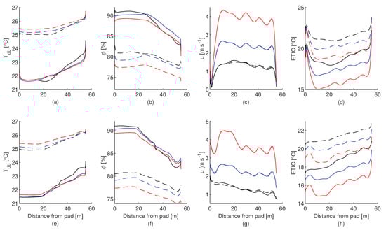 Profile of variation of the dry-bulb temperature (), relative humidity (), Equivalent Temperature Index for dairy Cattle (ETIC) and air velocity (u) along the centre of the tunnel-ventilated compost-packed bedded dairy barn. At 0.2 m (a–d) and 1 m (e–h) above the compost bedded, for two environmental conditions for dry-bulb temperature-relative humidity of 24 °C—75% (solid line) and 30 °C—55% (dashed line), and three airflow velocities across the exhaust fans: 1.5 m s (black line), 3 m s (blue line) and 5 m s (red line).
