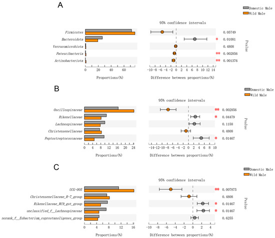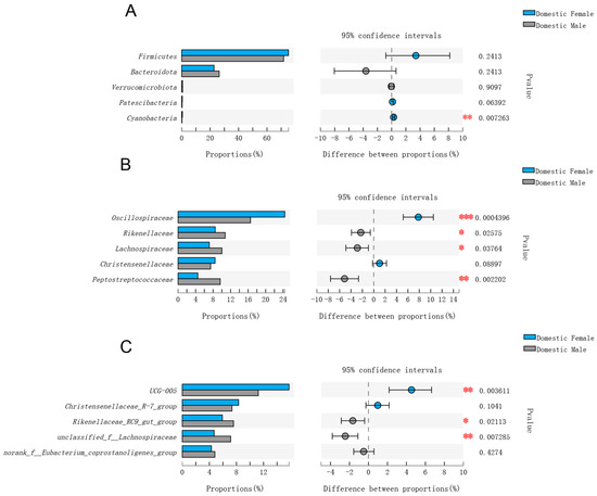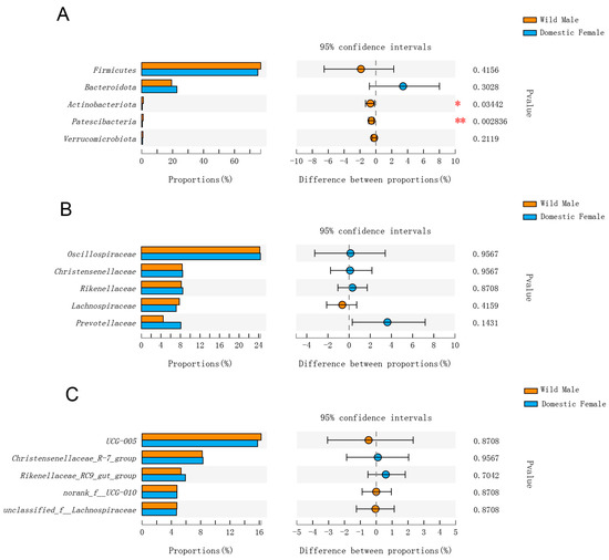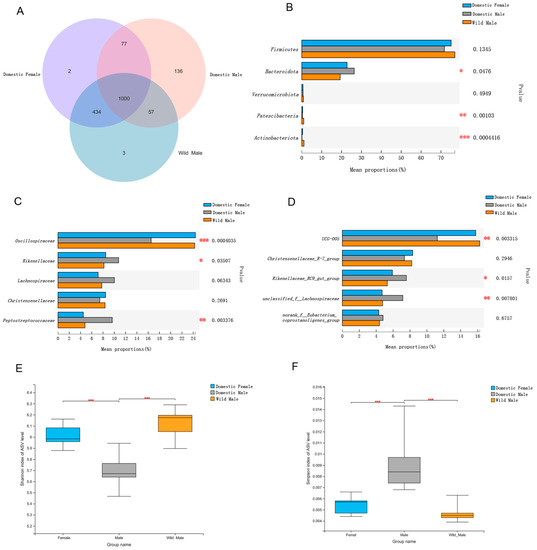 3.2. Comparison of Gut Microbial Composition among Domestic Females and Males and Wild Males
