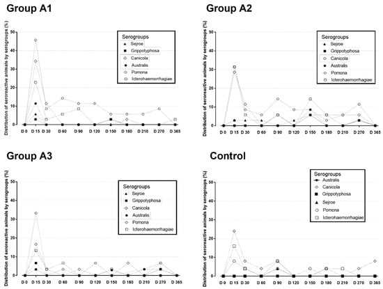 Distribution of seroreactive animals for MAT serogroups between the vaccinated (A1, A2, and A3) and unvaccinated (control) groups.