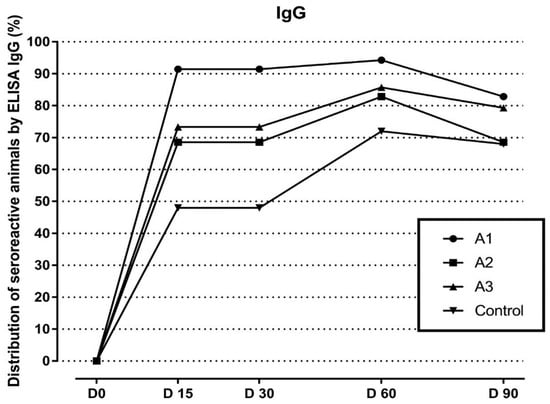 For that study 118 adult dogs were included, male or females, kept in a dog shelter in the metropolitan region of Rio de Janeiro, Brazil. That region is known to be endemic for canine and human leptospirosis [6]. Inclusion criteria were as follows: not vaccinated for leptospirosis for at least 12 months, no apparent symptoms of acute clinical disease, regular hematobiochemical condition (blood count, serum ALT and AST activity, serum creatinine and urea concentrations), seronegative for leptospirosis (Microagglutination Test—MAT), and negative at urinary PCR. Dogs were randomly divided into Group A (n = 94), vaccinated for leptospirosis and subdivided into three subgroups: Group A1 consisting of 32 dogs immunized with vaccine 1, Group A2 with 32 dogs immunized with vaccine 2, and Group A3 composed of 30 dogs immunized with vaccine 3. Group A dogs were vaccinated with only one dose of vaccine, with no booster. In addition, 24 animals were not vaccinated, representing the control Group B. All animals were kept together throughout the experiment and subjected to the same environmental conditions. Inspection was performed by the same veterinarian on all visits. He is an experienced certified professional. He followed the dogs throughout the study, and he has been voluntarily in charge of the shelter for at least 15 years. The following commercial vaccines were studied, all of them bacterins: Vaccine 1—Vanguard plus V10 (Zoetis®, São Paulo, Brazil), prepared, according to the manufacturer, with serovars Canicola, Icterohaemorrhagiae, Grippotyphosa and Pomona; Vaccine 2—Canine 1-DHPPI + L (Nobivac®, São Paulo, Brazil) prepared, according to the manufacturer, with serovars Canicola and Icterohaemorrhagiae/Copenhageni; and Vaccine 3—Recombitek® C6/CV (Merial®, Campinas, Brazil), prepared, according to the manufacturer, with serovars Canicola and Icterohaemorrhagiae.