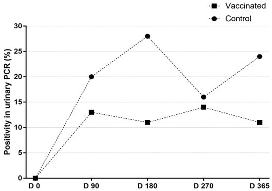 The most important outcome of our study was that, although vaccinated dogs can still act as carriers of leptospires, a significant reduction was observed in the vaccinated animals, indicating a partial protection against renal colonization and consequent shedding that, although far from the ideal, cannot be ignored. Importantly, to our knowledge, this is the longest study ever conducted, and it was also conducted under natural conditions in an endemic area, with high infective pressure. We could observe that unvaccinated dogs were more likely to become asymptomatic carriers than the vaccinated ones and shed leptospires in the urine for a longer period (consecutive positive results).