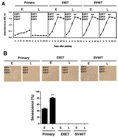 SV40T and E6E7 induce proliferation of BMECs containing E2F activators. (A) Growth curve comparison between primary and immortalized BMECs. Equal numbers of cells were cultured in a 96-well plate, and cells were periodically examined using CCK-8 in quadruplicate to obtain the growth curves (n = 4). ** p < 0.01 vs. primary BMECs. Primary BMECs or BMECs immortalized by E6E7 and SV40T were collected at early (E) and late (L) passages of culture. (B) Senescence-associated β-galactosidase staining to determine the status of senescence in primary and immortalized BMECs. Blue positive staining and large, flat morphology were observed in primary BMECs. Blue β-galactosidase staining was not observed in E6E7 and SV40T immortalized BMECs. The graph represents the percentage of senescent cells. ** p < 0.01 vs. primary early and immortalized BMECs. Primary BMECs or BMECs immortalized by E6E7 and SV40T were collected at early (E) and late (L) passages. The early and late stages of primary BMECs represent passages 10 and 30 of primary BMECs’ cultures, respectively. The early and late stages of immortalized BMECs represent passages 60 and 100 of immortalized BMECs’ cultures, respectively. Data are based on triplicate experiments.