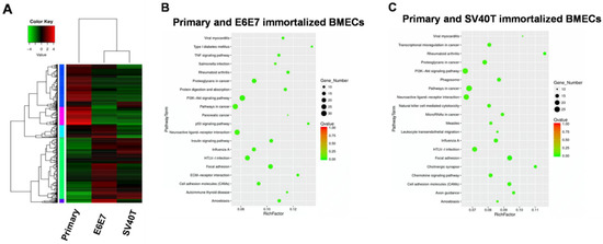 Transcriptome analysis for signaling pathways in primary and immortalized BMECs. (A) Hierarchical heat map showing the expression values for transcript mRNA in primary and immortalized bovine mammary epithelial cells (BMECs). Red indicates higher expression and green indicates lower expression. (B,C) KEGG pathway enrichment scatter diagram for differentially expressed genes. The range in the circle represents the number of differentially expressed genes in each pathway.