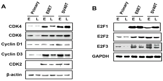 The Rb family controls cell proliferation and entry into the S-phase of the cell cycle by preferentially associating with three E2F activators. The E7 protein from the human papillomavirus, in addition to the SV40T antigen-induced transformation and proliferation, can disrupt Rb function. This, is turn, causes Rb to sequester E2F activators, thereby enhancing the expression of E2F target genes [13,14,15]. In addition, the SV40T antigen targets multiple cellular pathways to trigger cellular proliferation. SV40T disrupted Rb- and p53-dependent responses to enhance E2F1, E2F2, and E2F3, which drive quiescent cells to enter the S-phase [16]. We hypothesized that E2F activators may control the proliferation of BMECs. However, a recent study showed that the SV40T antigen induces proliferation and transformation in MEFs that lack the three E2F activators. In view of these previous findings, we investigated whether the proliferation of SV40T- and E6E7-induced bovine mammary epithelial cells (BMECs) requires E2F activators.