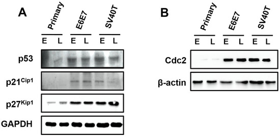 It is known that CDKs/cyclin D complex is subjected to the regulation of p21Cip1 and p27Kip1, which function as inhibitors of cell proliferation or regulators of cell cycle in the PI3K/AKT and p53 signaling pathways [27,28,29,30]. Importantly, both pathways were part of the ‘pathways in cancer’. We thus determined the expression of some genes (i.e., p53, p21Cip1, p27Kip1, and Cdc2) in the pathways by Western blotting analyses. To validate relevant downstream genes that might be responsible for the control of cellular growth arrest due to the loss of the E2F3 activator, we examined the E2F3 target gene and status of the p53 pathway in addition to various inhibitors of the cell cycle, including p21Cip1 and p27Kip1. The levels of p21Cip1 were undetectable at the stages of primary culture. Interestingly, p21Cip1 and p27Kip1 were expressed in E6E7- and SV40T-immortalized BMECs. These results suggest that p21Cip1 and p27Kip1 are not likely essential for p53 pathway target genes in this context. More importantly, the Cdc2 involved in the E2F3 target gene was not found at the total stages of primary culture and severely impaired the BMECs’ proliferation. However, the E6E7 viral protein and SV40T antigen could enhance Cdc2 overexpression and cell proliferation. Additionally, the ectopic expression of Cdc2 could bypass the G2/M phase checkpoint to escape programmed cell death. Altogether, these findings support the idea that SV40T/E6E7-induced proliferation is not involved in the p53 signal pathway in BMECs.