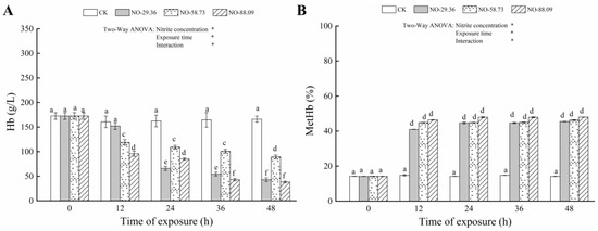 Nitrite diffuses from the blood into red blood cells, where it easily oxidizes iron in Hb to form MetHb [6]. In the current study, Hb levels were significantly reduced and MetHb levels increased in all nitrite-treated samples. Meanwhile, we observed a decrease in the concentration of Hb and an increase in the concentration of MetHb with the increase in nitrite concentration and exposure time. These findings suggest that nitrite caused oxidation of Hb to MetHb, reduced the oxygen-carrying capacity of the blood, and caused major toxic effects in the blood of large yellow croaker. Our results supported the previous finding that elevated nitrite levels and exposure times decreased Hb level as well as increased MetHb levels in Takifugu rubripes [27].