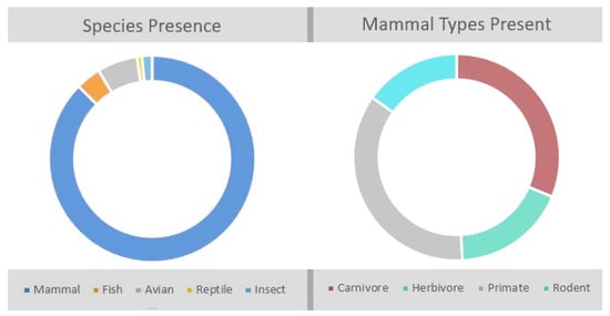 Along with diverse publishing, a variety of species are present in this work, with 52 total species accounted for. Of these species, mammalian participants are by far the most common class, as shown in Figure 2, with 87% of the participants being mammals. This prominence of mammalian enrichment has been seen in other reviews as well, particularly in zoo contexts [2]. In this group, primates [3,20,21,22,23,24,25,26,27,28,29,30,31,32,33,34,35,36,37,38,39,40,41,42,43,44,45,46,47,48,49,50,51,52] and carnivores [20,21,22,23,25,31,39,40,53,54,55,56,57,58,59,60,61,62,63,64,65,66,67,68,69,70,71,72,72] are the most utilized species. Second to mammals, birds make up a little over 6% of the literature. Much of this work focuses on raptors [25] and forest birds [73,74], with little work in aquatic birds such as cranes [40]. Reptiles [75], fish [76], and invertebrates [77] are all under 3% of the work. No amphibian studies were found, though enrichment studies before 2010 included them [78].