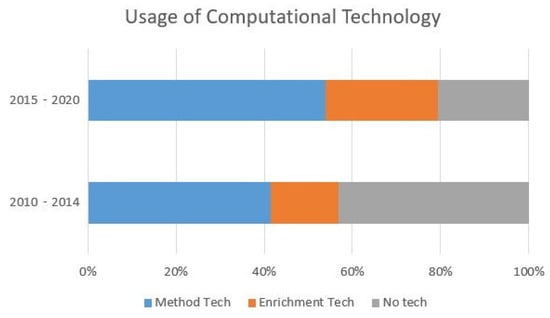 While computational technology is gradually becoming more common in enrichment devices, measurement technology for methodology is growing rapidly. As shown in Figure 3, the percentage of studies that contain a computational technological component is increasing, with the largest increase for methodology enhancing devices. This overall shift in methodology and materials may be further supported with ACI devices and evaluation frameworks.