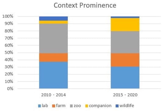 The distribution of these five contexts in the literature can be seen in Figure 4. The laboratory and zoo-dominated field has equalized as the decade progressed, with more companion and farm animal studies being conducted. The wildlife setting decreases tremendously, with only one study occurring in the second half of the decade.