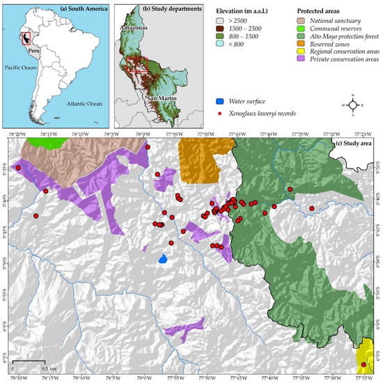 The study covers the departments of Amazonas and San Martin in northwestern Peru and are located between the parallels 3°0′ and 9°0′ south and the meridians 75°50′ and 78°80′ west (Figure 1). These are unique territories where records of X. loweryi have been reported (Figure 2) [1,4,5]. The department of Amazonas covers an estimated area of 42,050.32 km2 of rugged landscape and is largely under the Amazonian rainforest. This department is characterized by a “hot and humid”, “hot dry”, and “warm temperate and slightly humid” climate, with maximum temperatures of 40 °C in the lowland forest to the north and minimum temperatures of 2 °C in the highlands to the south. In some areas, there is a water shortage of 924 mm/year, while in others, there is a surplus of up to 3000 mm/year [37]. On the southern border, the department of San Martin has an estimated area of 48,307.81 km2 and is located in the Peruvian Amazon between the natural high-jungle and low-jungle regions. Due to its geographical location, San Martin has a warm, hot, and humid climate. The average annual temperature is 24 °C. The maximum rainfall is 280 mm from October to March, and the region experiences small precipitation events of more than 50 mm during July and August [38,39].
