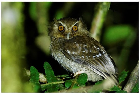 - BirdLife International Cinnamon Screech-Owl (Megascops petersoni)—BirdLife Species Factsheet. Available online: http://datazone.birdlife.org/species/factsheet/cinnamon-screech-owl-megascops-petersoni (accessed on 23 May 2022).
