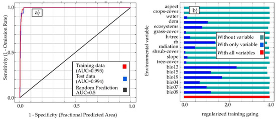 The model performance obtained shows an AUC > 0.995 (Figure 3a), indicating an excellent model. The results of the Jackknife test show the importance of the different environmental variables in mapping the habitat suitability of X. loweryi (Figure 3b).