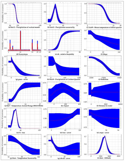 Response of environmental variables. In the figure, the y-axis indicates the probability of the species occurrence (logistic output). The red curves show the mean response, and the blue ranges are the standard deviation (±SD) calculated by 10 replicates. Most influential ecosystems for potential habitat suitability of X. loweryi (Figure 5d): 10, Yunga montane forest; 2, Yunga montane (pluvial) forest and 19, grassland/herbazales.