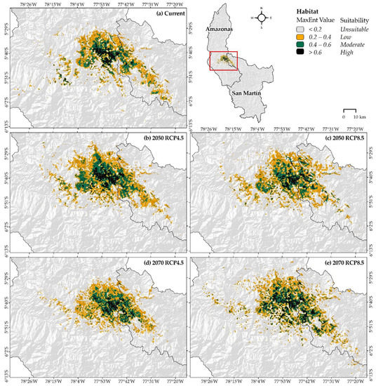 Under current conditions, the distribution of X. loweryi in the study area covers a geographical extent of “high”, “moderate”, and “low” suitability, comprising 140.85 km2 (0.16%), 416.88 km2 (0.46%), and 1048.79 km2 (1.16%), respectively (Table 1). Under future conditions, the habitat shows a slight increase from the current distribution. In the “high” potential distribution area of RCP 4.5, the habitat will decrease by −10.3% in 2070, and in RCP 8.5, it will decrease by −4.9% in 2050 (Table 1). The same trend is also observed for “moderate” and “low” potential habitat suitability areas. Finally, the total area of suitability covers only 1.78% (1606.52 km2) of the territory in the Amazonas and San Martin regions (Table 1). In this sense, the increase in the total future area is only driven by climate change in all of the RCPs (except for RCP 4.5 in 2070), regardless of the current and future anthropogenic disturbances.