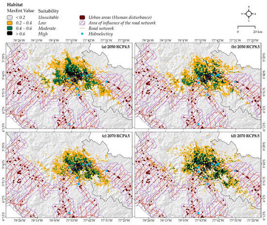 Human disturbance and climate change variables were combined to assess integrated habitat impacts for X. loweryi following the analysis of Zhent et al. [67]. In that sense, we selected four types of human disturbances, (urban areas from the National Geographic Institute (https://www.gob.pe/ign (accessed on 18 April 2020)), roads obtained from the Ministry of Transport and Communications [68], and hydroelectric power plants and power transmission lines from GEO GPS PERU (www.geogpsperu.com accessed on 28 October 2020) to represent the most frequently occurring disturbances in the study area. Consequently, the range of influence was set at a distance of 3 km for roads, and 2 km was set as the influence area for other disturbances. The researchers’ criteria established the areas of impact. Finally, all human disturbances were integrated, and then an overlay analysis was performed on the distribution maps for 2050 and 2070 in ArcGIS ver 10.5. This resulted in maps of showing the combined influence of climate change and human disturbances on the habitat suitability for X. loweryi for 2050 and 2070.