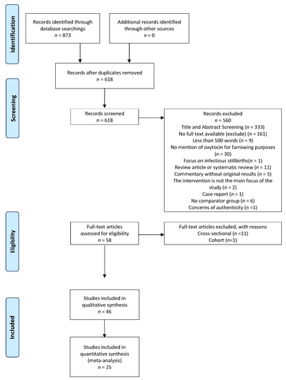 A total of 618 unique references were acquired from all the databases; 285 remained after the title/abstract screening, and 58 studies were deemed eligible after the full-test screening (Figure 1). Three hundred and thirty-three studies were excluded during the title and abstract stage for the following reasons: they were not written in English (9); there was no mention of the administration of exogenous oxytocin or carbetocin to sows (310); the article mentioned infectious causes of stillbirths (2); no abstract or full text were available (12). During the full-text stage, studies were excluded for the following reasons: the full text was not available in English (161); the text was <500 words (9); the text did not discuss the use of exogenous oxytocin for farrowing purposes (30); the focus of the text was infectious causes of stillbirths (1); the study design was a review article or systematic review (11); the study was a commentary without original results (5); the intervention was not the main focus (2); the paper was a case report (1); or there was no comparator group (6). One paper was excluded during the screening process due to concerns over its questionable experimental methods. Among the 58 studies deemed eligible for data extraction, the cross-sectional (11) and cohort (1) studies were not further processed. Therefore, 46 clinical-trial studies were eligible for data collection.