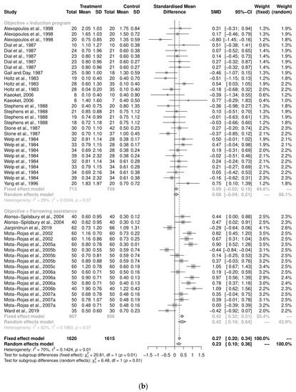 To explore heterogeneity between studies, sub-group analysis was explored for each of the outcomes of interest. A sub-group analysis was performed on study objectives ‘induction program’ and ‘farrowing assistance’. A separate meta-analysis was performed on each study objective, further analyzing the dosage, time of administration, and route of administration.