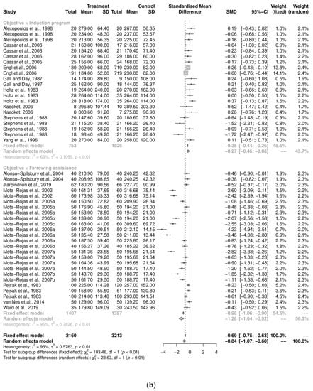 Twenty-four references had sufficient information for a meta-analysis on the average number of stillborn pigs per litter, farrowing duration, and/or birth interval between piglets. The results of the individual studies were further examined by categorizing them into the three outcome variables.