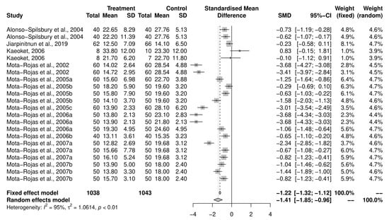There were 23 independent group means and SD for the birth interval between piglets in the intervention study group (23/11 studies). Most of the studies investigated the effects of oxytocin (22/23; 96%), and a small number studied carbetocin (1/23; 4.3%). The most common method of treatment administration was intramuscular (IM) (19/23; 83%), followed by intravenous (2/23; 8.7%) and intravulvar (IVU) (2/23; 8.7%). The most common dosage used for oxytocin was ‘based on weight’ (14/22; 64%). The lowest dosage was 10 IU (3/22; 13.6%), followed by 20 IU (2/22; 9.1%) and 40 IU (3/22; 3%). The comparator study group included 14 independent group means and SD for the time interval between piglets 14/11 studies), including no treatment (3/23; 13%), saline (10/23; 43.5%), and water (1/23; 4.3%). The mean interval between piglets in minutes for the comparator group was 22.1 ± 4.5 (n = 643 sows), and the mean time interval between piglets for the intervention group was 15.5 ± 5 (n = 1096 sows).