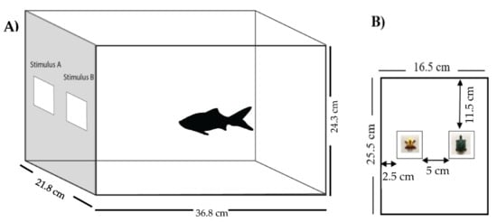 Object constancy is the ability to recognize an object despite changes in the retinal image of the object when it is rotated [,]. It is essential to visual perception in humans, with infants beginning to show evidence of these processes at just a few months, or sometimes even days old [,,]. Although very young infants can recognize objects at different orientations, more sophisticated mental representations develop throughout the first several years of life []. Animals of most species frequently view their surroundings from different viewpoints. Therefore, possessing object constancy may be advantageous for non-human animals to recognize objects and individuals visually [,]. Fish live in aquatic environments, making it easier for them to view objects from a wide variety of orientations, including from above and below. Therefore, it would be especially beneficial for fish to possess object constancy (shape or form constancy) abilities so they are able to recognize objects, such as food sources, predators, or conspecifics, despite changes in the viewing angle [].