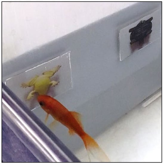 Our primary motivation was to continue our investigations of the conditions under which fish exhibit viewpoint-independence vs. viewpoint-dependence. However, because these fish subjects were first trained to discriminate between 3D stimuli then presented with 2D photographs of the same stimuli, this study is also a first attempt at examining object-picture recognition in goldfish. Object-picture recognition is the ability to recognize the correspondence between an actual object and a picture of that object []. In the field of comparative cognition, photographs are often presented to non-human animals [,,]. However, it is still unclear for many species if they are able to perceive these pictures as representations of real objects, but not the object itself [,]. Pigeons were able to transfer their discrimination of real objects to pictures of those objects [,,,]. Similar findings have also been discovered in hens [], bees [], bears [], and primates [,,]. In some of these studies, the animal(s) were able to transfer from objects to pictures as well as pictures to objects [,,,,]. If the goldfish in the current study could transfer their discrimination from the 3D turtle and frog models to the photographs of turtles and frogs, it may provide partial evidence for object-photo recognition in fish.