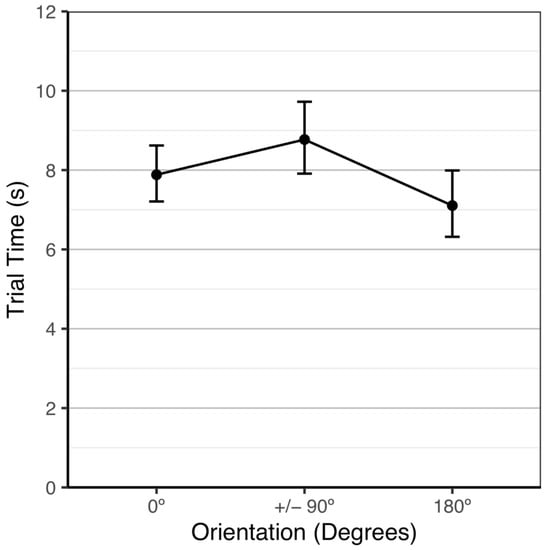 Trial times varied significantly among stimuli orientation, χ2(3) = 12.91, p = 0.005. By examining orthogonal linear and quadratic trends as the stimuli were rotated from 0° to ±90° to 180°, we assessed the functional form of trial time as the stimuli orientation was rotated. While there was no significant linear trend, Z = −1.77, p = 0.207, there was a significant quadratic trend, Z = −3.45, p = 0.003, which is shown in Figure 3. The fish were not significantly faster at a 0° orientation (M = 7.9 s, 95% CI: [7.3, 8.5]) than at a ±90° orientation (M = 8.8 s, 95% CI: [8.1, 9.6]), Z = −2.16, p = 0.079 or at a 180° orientation (M = 7.1 s, 95% CI: [6.4, 7.8]), Z = 1.77, p = 0.178. The fish were significantly faster at a 180° orientation than at a ±90° orientation, Z = −3.57, p = 0.001.