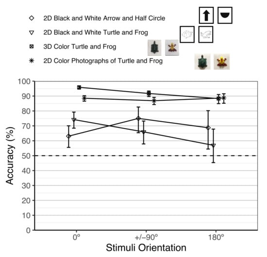 There has been a debate in the literature about how humans recognize objects at different viewpoints that have focused on two theories: viewpoint-dependent representations and viewpoint-independent representations. Many studies supported the idea of viewpoint-dependence [,,] where the visual system encodes the image of an object at the time of viewing, locking in one viewing angle. Multiple 2D representations of the object can then be activated when the object is viewed again in order to achieve object constancy [,,]. Typical performance in this type of study would include decreased accuracy and increased trial time as the stimuli are rotated further away from 0°. However, others found evidence of viewpoint-independent object representations [] where an object is encoded with a 3D representation that is activated no matter the orientation, size, or location of the object as it is viewed [,]. Typical performance in this type of study would include accuracy and trial times that do not differ at all aspect angles of the stimulus. Recent studies have suggested that the human visual system encodes multiple kinds of information that fall in line with both viewpoint-dependent and viewpoint-independent representations, but also information that goes beyond just the orientation of the object such as the textures of the object, or the effects of lighting on an object at different rotations [,]. The wide variety of information about an object can then be selectively used by an individual when it is appropriate depending on the recognition task they are involved in []. Non-human animals could also benefit from the large amount of visual information about an object by using both viewpoint-independent and viewpoint-dependent processes [,,,].