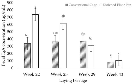 Least square mean estimates (±SEM) of fecal (secretory) immunoglobulin-A (IgA) concentrations in hens that were housed in conventional cages or enriched floor pens during weeks 22, 25, 29, and 43 of age. Bars lacking a common superscript differ at p < 0.05.