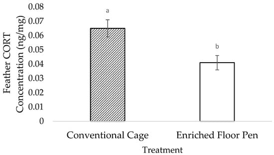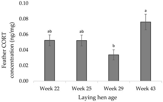 Tail feathers (n = 6/treatment per timepoint; 48 samples total) were collected during weeks 22, 25, 29, and 43 of age to determine the feather CORT concentrations. The tail feather samples were collected by cutting the calamus as close to the skin as possible without contacting or damaging the skin. At each sampling timepoint, different tail feathers were collected, thus the same tail feather was never collected more than once. The birds were arbitrarily selected from floor pens (3 birds/pen) and conventional cages (1 bird/cage) for feather sampling at each timepoint. Across ages, six birds were selected twice, and 36 birds were selected once. Following collection, the feathers were stored in Whirl Pac bags (Nasco, Fort Atkinson, WI, USA) and stored at −20 °C until assay. Visual inspection ensured that the least damaged feathers were selected for the assay. The feather CORT concentrations were determined following an extraction procedure that was described in []. First, the feathers were weighed (mg) to standardize the feather CORT concentrations by feather weight. The feathers were finely minced (including vane and rachis) using surgical scissors (<5 mm sections) into 20 mL scintillation vials. Following mincing, 1 mL of methanol was added and the vials were placed in a sonicating water bath at room temperature for 30 min. The samples were then placed in a shaking hot water bath (Jouan Inc., Precision Sci. Div. Chicago, IL, USA) at 56 °C overnight. The samples were filtered to remove feather material and the filtrate was transferred to scintillation vials. The methanol was allowed to evaporate completely under a fume hood and CORT was reconstituted in 1 mL ELISA buffer. Reconstituted CORT concentrations were assayed using a commercial ELISA kit (Abcam, Cambridge, MA, USA) following the manufacturers protocol. The intra-assay CV% were below 13% for all the feather CORT samples (range: 0.15–12.50%).