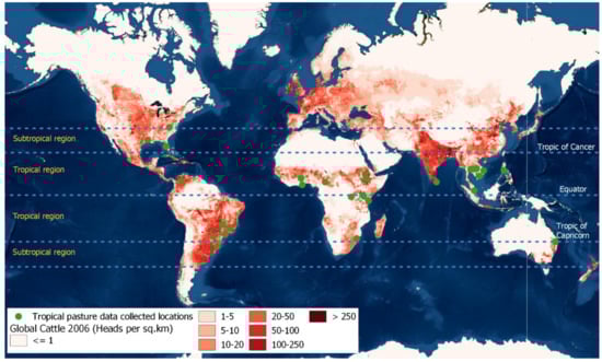 Spatial distribution of the tropical pasture data. Base map: global cattle distribution using the Gridded Livestock of the World 2 global distribution [] derived from ArcGIS Pro 2.8.6 (ESRI, California, USA) [].